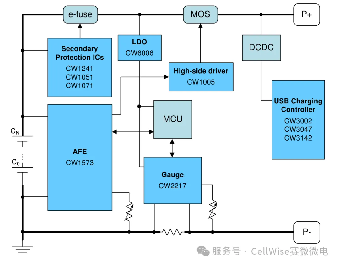CW1573是一款高精度的模拟前端芯片(AFE),适用于3~7串锂电池、磷酸铁锂电池、锂聚合物以及钠离子电池。芯片内置16bit ADC,可为电池包提供高精度的电压(±10mV)、电流和温度(±1℃)采样。该产品集成了硬件保护功能,包括过充电、过放电、过电流、短路以及温度保护,相关参数可灵活设置,确保电池包的使用安全。